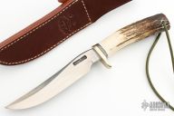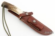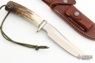 This model 3-6 from Randall Made Knives has an upswept satin finished blade with .206" blade stock and 1.194" blade depth, hidden tang construction. The handle is comprised of a nickel silver guard, stag grip, lanyard hole in the butt and black duralumin spacers. Includes brown leather sheath. Excellent condition.
