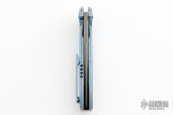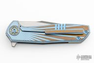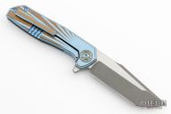 This Ragnarok V1 from Nick Churpin of NCC Knives features a stonewashed harpoon style blade with milled bevels, false top edge, and flipper. The handle has tumble/anodize (cracked ice) finish milled titanium scales with matching tip up clip. Two-piece satin finish titinaium pivot and backspacer. Solar Flare frame option. Comes with zipper case and COA. New from maker!