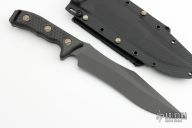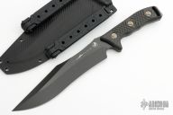 This Arbiter by Microtech features a two-tone DLC recurve blade with a notched thumbrest and sharpened top edge. The handle has carbon fiber scales with bronzed hardware, .213" blade thickness and 1.879" blade depth, full tang construction. But has a lanyard hole. Comes with kydex sheath with MOLLE locks. Comes with original box and papers. Serial number 095 and dated 05/2023. New condition.