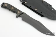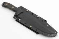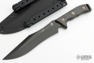 This Arbiter by Microtech features a two-tone DLC recurve partially serrated blade with a notched thumbrest and sharpened top edge. The handle has carbon fiber scales with bronzed hardware, .213" blade thickness and 1.879" blade depth, full tang construction. But has a lanyard hole. Comes with kydex sheath with MOLLE locks. Comes with original box and papers. Serial number 114 and dated 05/2023. New condition.