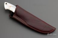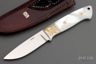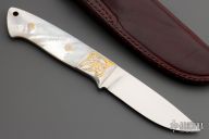 This fixed blade by Dwight Towell features a hand rub satin finished blade with .181" blade stock and 1.017" blade depth, full tapered tang construction. The handle has beautifully engraved stainless steel bolsters with 24k gold inlays, beautiful mother of pearl scales with engraved and 24k gold inlaid stainless steel pins. Comes with a brown leather sheath. Comes with a zippered case. "9" on the underside of the tang (could also be a 6 i guess). Excellent condition. Engraving done by Julie Warenski