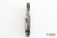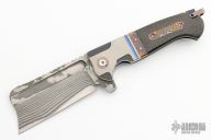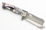 This Battle Cleaver by Andre De Villiers features a VG-10 San Mai cleaver style blade with notched thumbrest and flipper, fullers and hole in the blade. The handle has a two-tone titanium frame with milled mokuti inlays and pivot collars, milled and anodized tip up titanium clip with roller, mokuti inlay in the titanium backspacer, stainless lockface insert with integral overtravel stop. Rides on bearing, nice detent, lockup and blade seating. Comes with zippered case. Has a couple light scuffs and scratches, excellent condition otherwise.