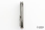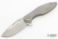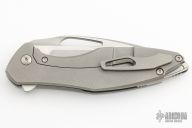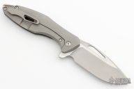 This Arius by Koenig knives features a stonewashed blade with satin flats, thumbhole and flipper. The handle has a bead blasted titanium frame with a titanium tip up clip, anodized titanium backspacer. Has ceramic bearings and a ceramic detent ball. Nice detent, lockup and blade seating. Comes with original box and COA dated 9/26/2022. Excellent condition.