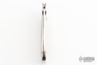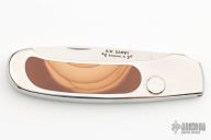 The knife by Scott Sawby features a hand rub satin finished blade with nail nick. The handle has a mirror polished stainless steel frame with Petersite inlays. Nice blade seating and lockup and closes via Scott's bottom lock release. A truly elegant piece with class. Excellent condition. Comes with a cloth pouch.