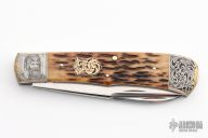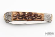I prefer making collector grade folders, but I make a few bowies, chute knives, etc. on occasion. I use CTS-XHP, PSF-27, CPM-154, CPM-D2, BG-42, D-2, S30V, S60V, RWL-34 and a fair amount of damascus. My primary frame materials is 416 stainless steel. I like stable handle materials such as mother of pearl, minerals and jigged bone, but I also use mammoth and hippo ivories, and a few woods, micarta and carbon fiber. I was a voting member of the Knifemaker’s Guild from 1983 through 2016 and never missed a show. I’m also a charter member of the Texas Knifemakers Association. Also, I am a member of the CKCA (Custom Knife Collectors Association).