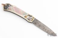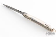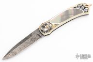 This Interframe Slipjoint from Warren Osborne features a Damascus blade with a nail nick. The handle has a stainless steel frame with black lip pearl inlays, stainless steel spring, gold lanyard bail. The frame has been engraved by Jon Robyn and has gold inlays. Includes a felt case. Excellent condition.  #015