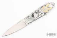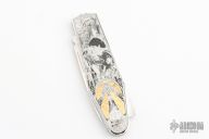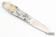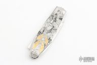 This Lockback by Alexis Lecocq features a hand rub satin finished spear point blade with dual nail nicks. The handle has a stainless steel frame and has clocked/timed screws that almost disappear in the handles engraving. The engraving was done by Simone Fezzardi and has gold inlays, really stunning! Nice lockup and blade seating. Comes with a zippered case. Excellent condition.