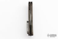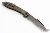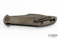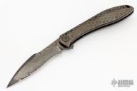 This Snake by Jerry Moen features a mirrored and DLC coated Damasteel blade with notched flipper. The handle has a milled DLC coated titanium frame, backspacer and tip up clip with ceramic ball insert, bronze titanium hardware. Has an inlaid titanium liner, rides on bearings, nice detent and blade seating. Comes with a zippered case and COA. Has a little vertical blade play, otherwise excellent condition.