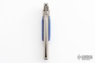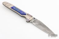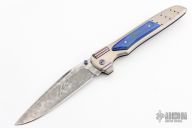 This Spring lock folder was entirely hand-made by Jacques Jobin. The blade is Damascus with two lapis inlaid thumbstuds and a fileworked thumbrest. Blade is a Devin Thomas stainless Damascus. Liners are in solid titanium, anodized and satin finished, has lapis overlays with black G-10 backing. Has creative filework and filling on the handle. Nice strong lockup and good blade seating. Comes with zippered case. Has a few very light scratches, otherwise excellent condition.