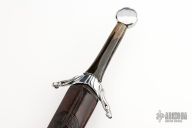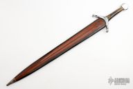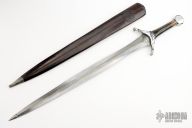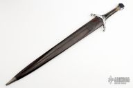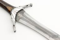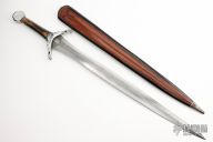 This is Roger Bergh's first sword. It  features a Damascus double edged wasp waist blade with a Rondel Dagger-styled armor-piercing tip. The Damascus has a thick nickel band giving it a San Mai Damscus look, .375" blade stock and 12.035" blade depth, and hidden tang construction. The hilt has a sterling silver rain-guard stamped with his maker's mark, a carved and polished stainless steel guard with upturned quillions, a wheel pommel, and a giraffe bone grip. It comes with a hand-tooled brown/black leather scabbard with wooden core, and a zippered case. Excellent condition.