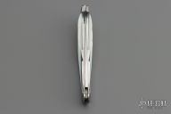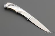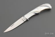 This lockback by Wolfgang Loerchner features a hand rub satin finished blade with nail nick. The handle has a mirror polished and hand carved stainless steel frame with hand carved mother of pearl inlays, stainless steel backspacer. Nice lockup and blade seating. Comes with a zippered case. Excellent+ condition.