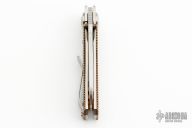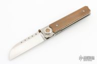 This Space Rayzor by Eddie Baca features a hand rub satin finished sheepsfoot blade with dual fileworked copper thumbstuds, notched thumbrest. The handle has a satin finished titanium frame with fileworked copper overlays, pivot inlays and backspacer, tip up orange peel finished titanium clip. Nice detent, lockup and blade seating. Excellent condition.