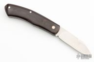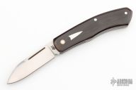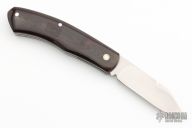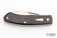 This Dino slipjoint by David Taber features a hand rub satin finished blade with nail nick. The handle has burgundy linen micarta covers, stainless steel liners, escutcheon and spring. Half stop blade position, flush in all positions. Strong function. Excellent condition.