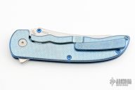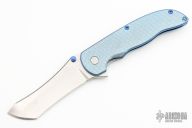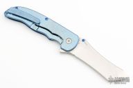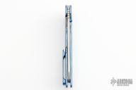 This Norseman (#6683) by John Grimsmo features a stonewashed blade with a single titanium thumb stud, notched thumb ramp and flipper. The handle features anodized finished and crosshatch textured titanium frame with titanium screws. Very smooth action that requires no wrist movement. Nice detent, lockup and blade seating. Rides on ceramic bearings. Knife is in excellent condition, shows no signs of use or carry. Comes with original custom hard case, Nano-Oil, tool, and COA dated Feb 3, 2023.