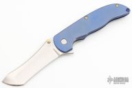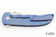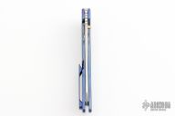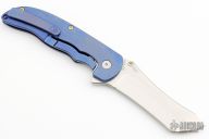 This Norseman (#6567) by John Grimsmo features a stonewashed blade with a single anodized titanium thumb stud, notched thumb ramp and flipper. Stonewash and anodized finished titanium frame with anodized titanium screws. Has a matching clip with hidden screws. Very smooth action that requires no wrist movement. Nice detent, lockup and blade seating. Rides on ceramic bearings. Comes with original packaging, custom hard case, Nano-Oil, tool, and COA dated Dec 17, 2022. Excellent condition.