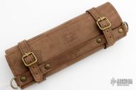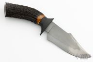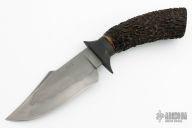 This Small Stag Fighter by Cristian Silva features a recurve blade with nice hamon, swedge, .136" blade stock and 1.716" blade depth, hidden tang construction. The handle has a black metallic guard, spacer, and a beautiful stag grip. Comes with a very well made leather roll. New from maker at the 2023 Blade Show.