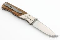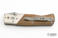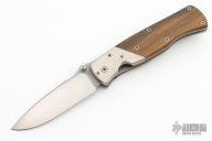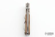 This linerlocking folder by Peter Marzitelli features a two-tone blade with bead blast flats and hand rub satin grinds, notched thumbrest and dual thumbstuds. The handle has titanium dovetailed bolsters and wenge wood scales with brown canvas micarta liners, satin finished titanium liners, bead blasted titanium clip, tip up carry. Nice detent, blade seating and lockup. Has some light scratches, otherwise excellent condition.