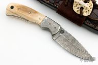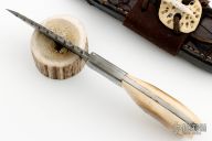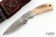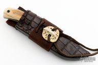 This knife by Larry Pridgen features a Damascus blade with .134" blade stock and 1.106" blade depth, full tang construction. The handle has a dovetailed Damascus bolsters with brass pins, mammoth ivory scales with mosaic pins. Comes with a brown alligator leather sheath. Has some patina, otherwise excellent condition.