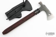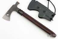 This Hammer Pole Tomahawk by Half Face Blades features 2.25" blade with hammer pole at the rear, .216" blade stock, full tang construction. The handle has red/black G-10 scales with white liners. Comes with a kydex sheath. Excellent condition.