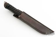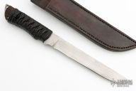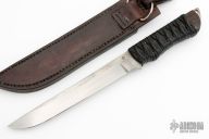 This Bulldozer by Don Fogg features a hand rub satin finished blade with forge finish flats, .247" blade stock and 1.089" blade depth, full tang construction. The handle is comprised of black cord wrap over wood scales with brass pins. Excellent condition. Includes a zippered case and original leather sheath.