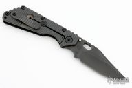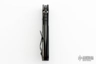 This Mick Strider SMF Bowie framelock folder features a black blade with thumbhole and notched thumbrest. The handle has a black aluminum and flamed titanium frame with titanium clip, tip up carry, lockbar stabilizer. Jimping on blade spine. Nice lockup, detent, and blade seating. Excellent condition.