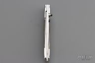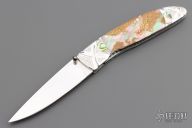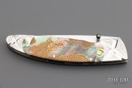 This Okina from Koji Hara features a mirror polished blade with a single thumbstud with black lip pearl inlay. The handle has fluted stainless steel frame with abalone and black lip pearl inlays, jeweled stainless steel liner, stainless steel backspacer with black lip pearl inlays. The handle is adorned with a gold Maki-e of a dragon. Smooth action with a nice detent, blade seating and lockup. Excellent condition. This is the most beautiful Koji Hara knife I have ever seen.