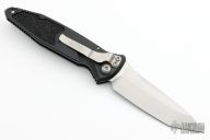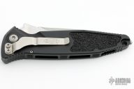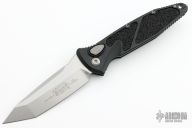 This Socom Elite Auto by Microtech has a stonewashed tanto blade with a notched thumbrest. Black aluminum handle with non-slip inserts. Stainless steel clip, tip down carry. Glass breaker. Dated 04/2023 and s/n 9189. Comes with original box and papers. Excellent condition.