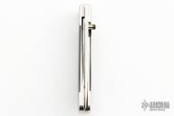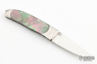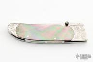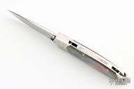 This linerlock folder from Koji Hara features a mirror polished blade with single thumbstud with a black lip pearl inlay. The handle has a stippled stainless steel frame with black lip pearl inlays. Black lip pearl inlays in the stainless steel backspacer, lanyard pin. Smooth action. Solid lockup, detent and blade seating. Excellent condition.