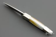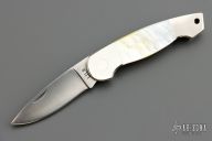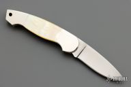 This Slipjoint by Jimmy Lile features a satin finish blade with nail nick, nickel silver dovetailed double bolsters with integral liners, gold lip pearl scales. Has a few light scratches, otherwise excellent condition.