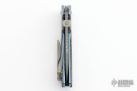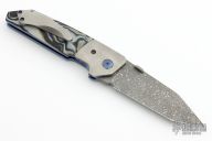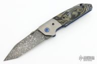 This Pale Horse by Allen Elishewitz features a Black Snow finished blade with a knurled thumb disc. The handle has bead blasted and dovetailed titanium bolsters, burl G-10 scales, textured and anodized titanium liners, bead blasted titanium clip, black G-10 backspacer. Comes with a leather case.  Excellent Condition.