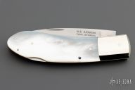 This lockback folder by WE Ankrom features a hand rub satin finished blade with nail nick. The handle has dovetailed nickel silver bolsters, mother of pearl covers, nickel silver liners, and a stainless steel lockbar. Has a couple light scratches, excellent condition otherwise.