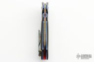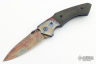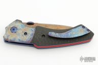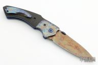 This White Swan Linerlock Flipper from Allen Elishewitz features a Antique finished drop point blade with a knurled thumb disc.  The handle has an antiqued finished dovetailed titanium bolsters, carbon fiber scales, textured and anodized titanium liners, red G-10 backspacer and a titanium tip up pocket clip. Excellent condition.