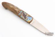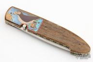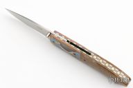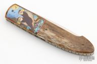 This linerlock folder by Stan Fujisaka features a hand rub satin finished blade with single thumbstud. The handle has engraved anodized titanium dovetailed bolsters, engraving done by Judy Beaver, giraffe bone scales, fileworked two-tone anodized titanium liners and backspacer. Smooth action with a nice detent, lockup and blade seating. Excellent condition.