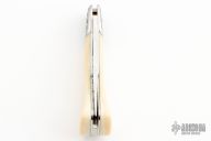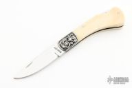 This slipjoint by Claude Montjoy features a mirror finished blade with nail nick. The handle has engraved and dovetailed stainless steel bolsters, mammoth ivory scales, stainless steel liners and backspacer. Has a few light scratches, otherwise excellent condition.