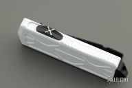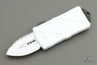 This Microtech Exocet features a 204p white finish dagger shape blade with full serrations. The handle has white aluminum handles and a black stainless clip that doubles as a money clip dated 07/2021, S/N 1110. Comes with original box and papers. Excellent condition.
