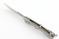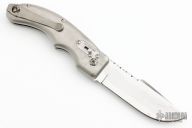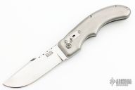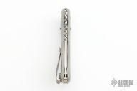This Cholla by BladesIIB Knives was named after a "Jumping Cactus" in Arizona. The blade with satin finished grinds and mirror polished flats, fileworked thumbrest and notched front flipper. The handle has a bead blasted titanium frame, tip up titanium clip. The locking mechanism is the Triple "B"S, or Bud Beets Ball Slide - BladesIIB Pat. 10,981,283. Comes with original box and papers. New from maker at the 2023 Blade Show.