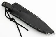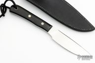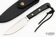 This skinner from Charles Ochs son Micah Ochs features a mirror finished blade, .168" blade stock and 1.108" blade depth. The handle has black paper micarta scales with nickel silver pins and lanyard tube over full tapered tang construction. Black leather sheath. Excellent condition.