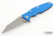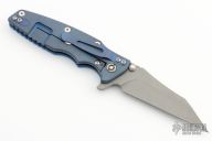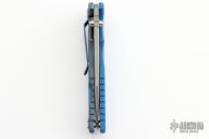 This Eklipse Flipper by Rick Hinderer Knives features a 3.5" working finished blade, notched thumbrest and flipper, dual thumbstuds. The handle has a blue G-10 scale, and battle blue titanium handle/clip. Clip can be mounted for tip up or down carry. Nice lockup, seating, and detent. Comes with original box and extra hardware. New condition.