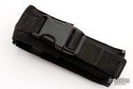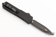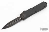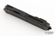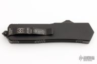 This Executive Scarab OTF auto by Microtech has a black D/E blade with fullers. The handle is black aluminum with a single glass breaker, tip down black stainless steel clip. All black hardware. Dated 07/06 and S/N 00801. Comes with original sheath. Has a couple light scuffs and scratches, Excellent condition otherwise.