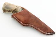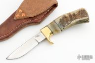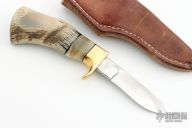 This Pronghorn by Master Smith Bill Burke features a 52100 hand forged drop point blade with visible temper line, .177" blade stock and 1.845" blade depth, hidden tang construction. The handle has a brass guard and sheep horn handle. Includes a brown leather belt sheath. Has some finishing scratches, otherwise excellent condition.