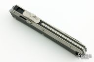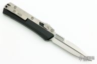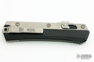This Glykon by Microtech features a stonewashed double edged blade with fullers and notched thumbrest. The handle has a black aluminum chassis with bead blasted titanium overlays and tip down clip. Comes with original box and papers. Excellent condition. Dated 04/2023 and #976