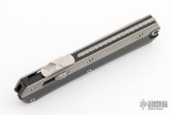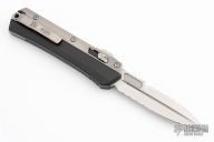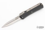 This Glykon by Microtech features a stonewashed double edged fully serrated blade with fullers and notched thumbrest. The handle has a black aluminum chassis with bead blasted titanium overlays and tip down clip. Comes with original box and papers. Excellent condition. Dated 04/2023 and #889