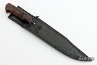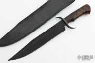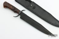 This Bowie by Journeyman Smith Andre Klen features a parkerized blade with a nearly sharpened top edge, .238" blade stock and 1.715" blade depth, hidden tang construction. The handle has a parkerized steel guard and a stabilized spalted wood grip. Comes with a hand tooled black leather sheath. Has a couple very light scuffs, otherwise excellent condition.