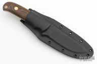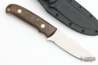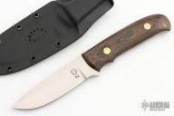 This K-53 Arkansas Drop Point by Dozier Knives features a satin finished drop point blade, .134" blade stock and 1.087" blade depth, full tang construction. The handle has camo linen micarta scales with brass pins and lanyard hole. Comes with kydex sheath with belt loop. New from maker at the 2023 Blade Show.