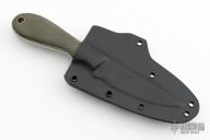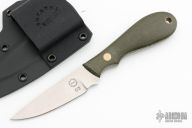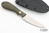 This Custom Caper by Dozier Knives features a satin finished blade with notched thumbrest, .104" blade stock and .825" blade depth, full tang construction. The handle has green linen micarta scales with brass pin and lanyard hole. Comes with a kydex sheath. New from maker at the 2023 Blade Show.