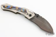 This M250 Scout M6 from Dwaine Carrillo features a black oxide finished recurve blade with notched thumbrest and dual thumbstuds. "Iron Rhino" and "CD-250RGB" and "UBOLT" and "M6" milled into the blade. The handle has a milled OD Green G10 "A" side and satin finished titanium lockside, aluminum backspacers, tip up titanium clip that has an anodized pattern. Comes in a padded Pelican case. Has a couple light scratches on the frame, Excellent condition otherwise.