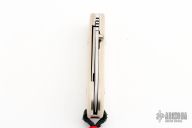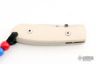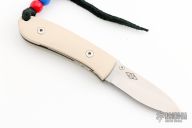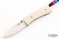This DK-FHL linerlock folder by Dozier Knives has a satin finished D2 stainless steel drop point D2 blade with notched thumbrest and single thumbstud. The handle has White Paper Micarta scales, titanium liners and backspacer. New from maker at the 2023 Blade Show.