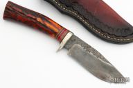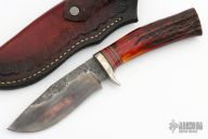 This Hunter by Will Dutton features a hand forged 1084 carbon steel blade with antiqued grinds and forge finished flats, .160" blade stock and 1.250" blade depth, hidden tang construction. The handle has a nickel silver guard, stag grip, black/natural canvas micarta/white/red spacers. Comes with a hand tooled brown leather sheath. New from maker at the 2023 Blade Show.