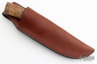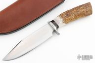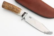 This fixed blade by Mike Malosh features a stag handle with black/aluminum/red spacers. Stainless steel guard and satin finish blade with .176" blade stock and 1.398" blade depth. Includes a brown leather sheath with belt loop. New from maker at the 2023 Blade Show.