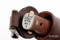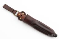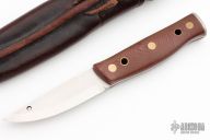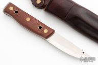 This knife features a satin finished scandi ground blade, .129" blade stock and 1.014" blade depth, full tang construction. The handle has brown canvas micarta scales with brass pins and tubes and a steel butt plate. Comes with brown leather sheath. Excellent Condition.